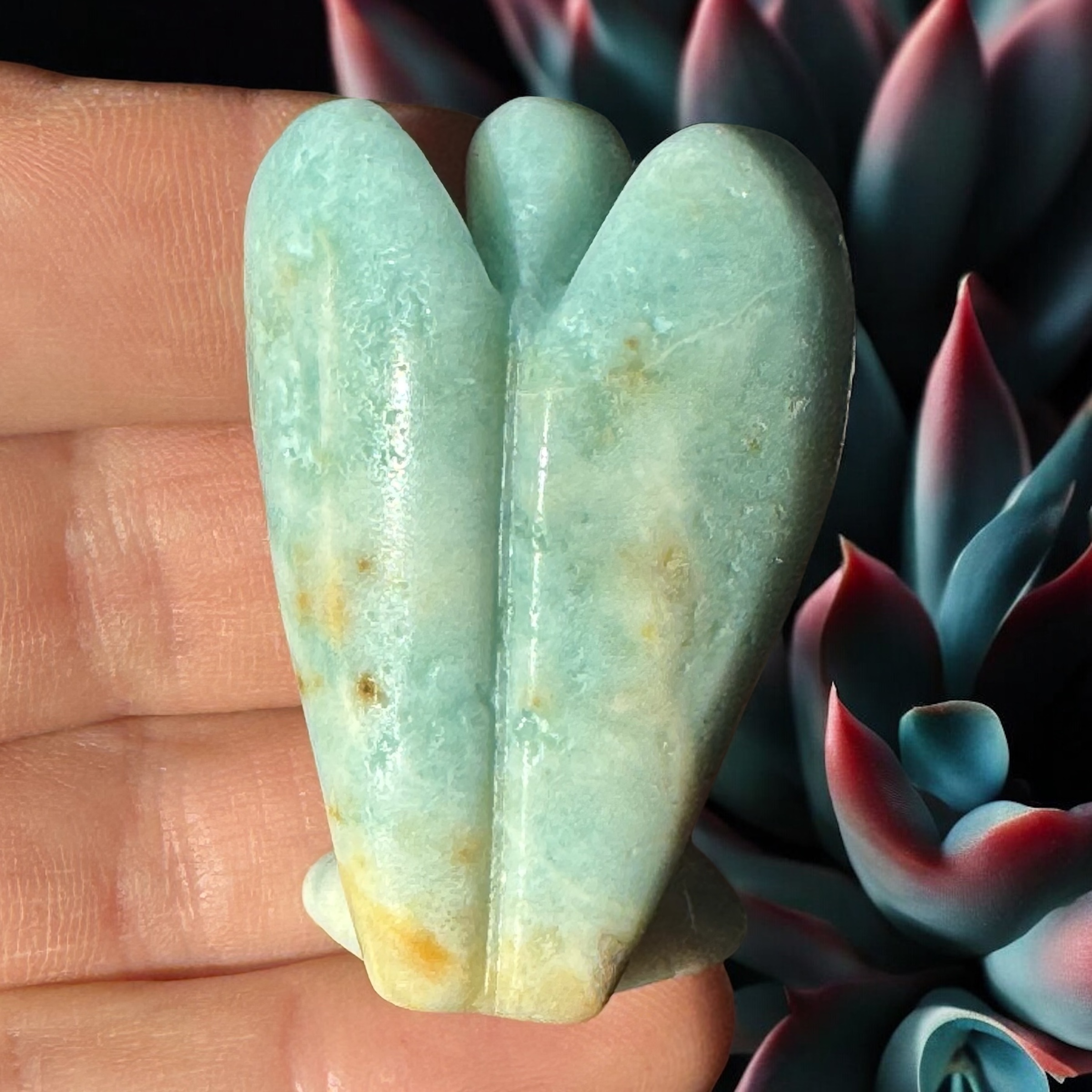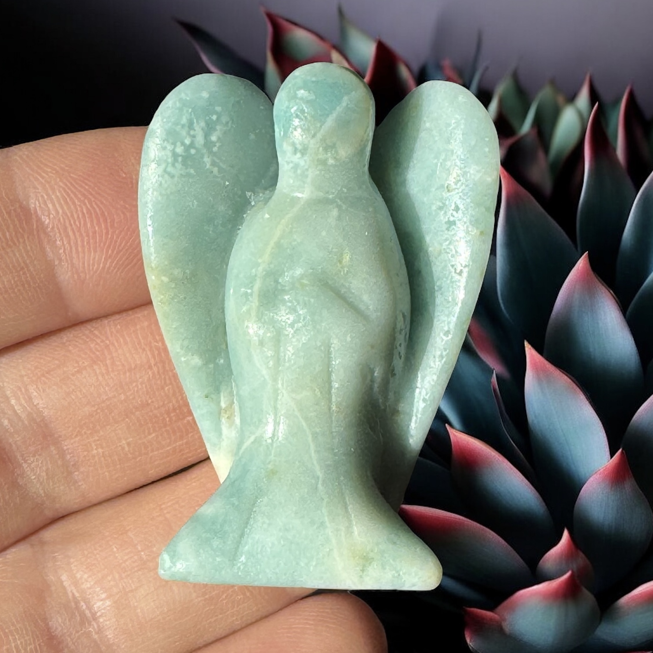 En Amazonit Engel er som en venlig vogter ved hjertet: den beroliger, åbner stemmen og giver roligt mod, så du kan stå ved dig selv – kærligt, sandt og klart.