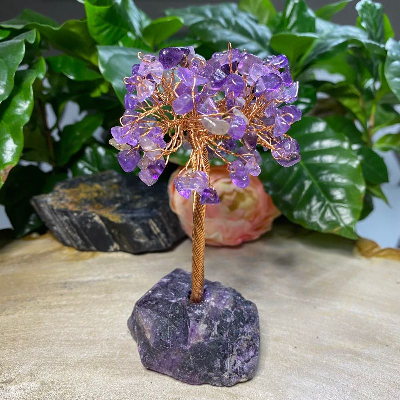 Det smukke træ med lilla ametyst krystal siges at have helbredende egenskaber, og træformen siges at være åndeligt opløftende.