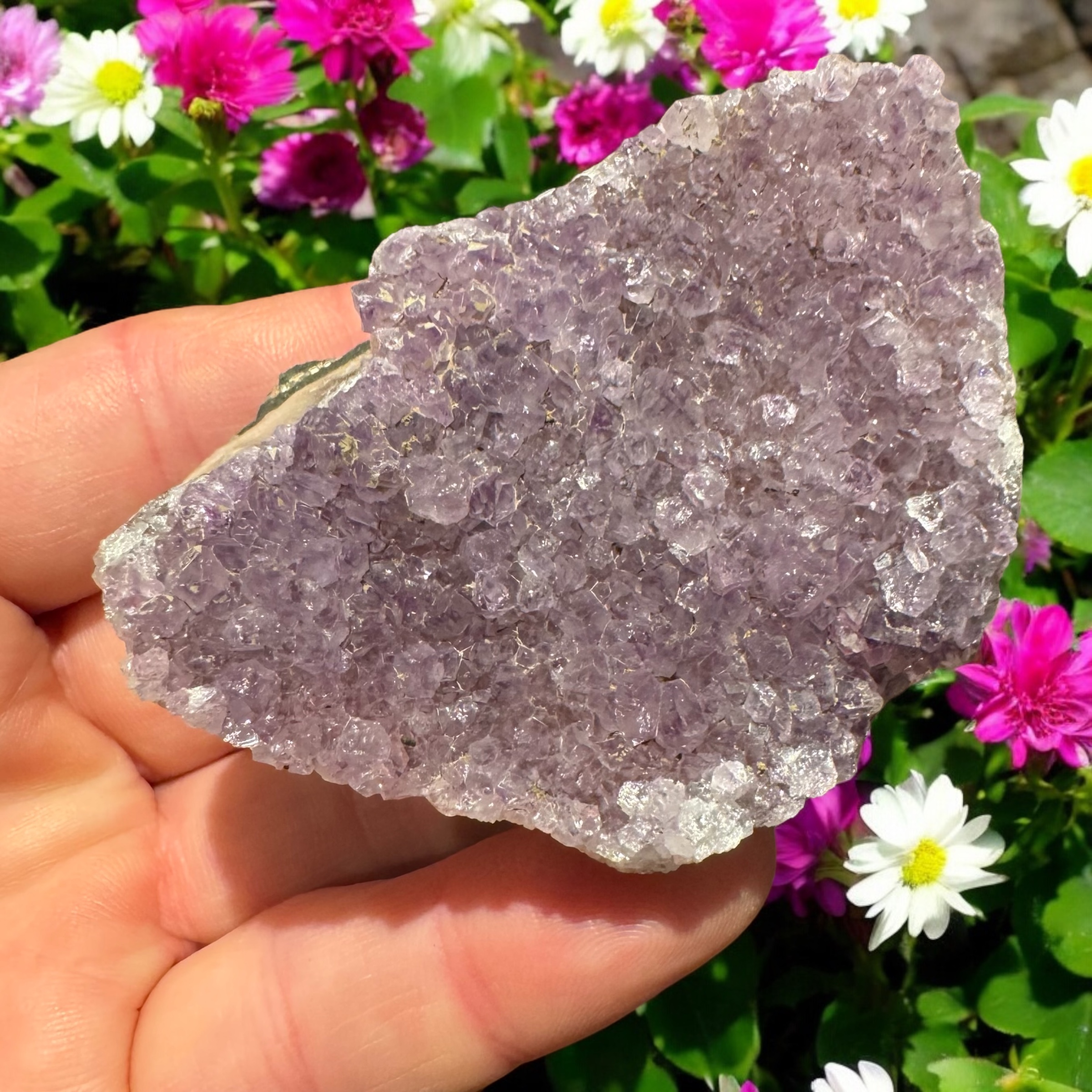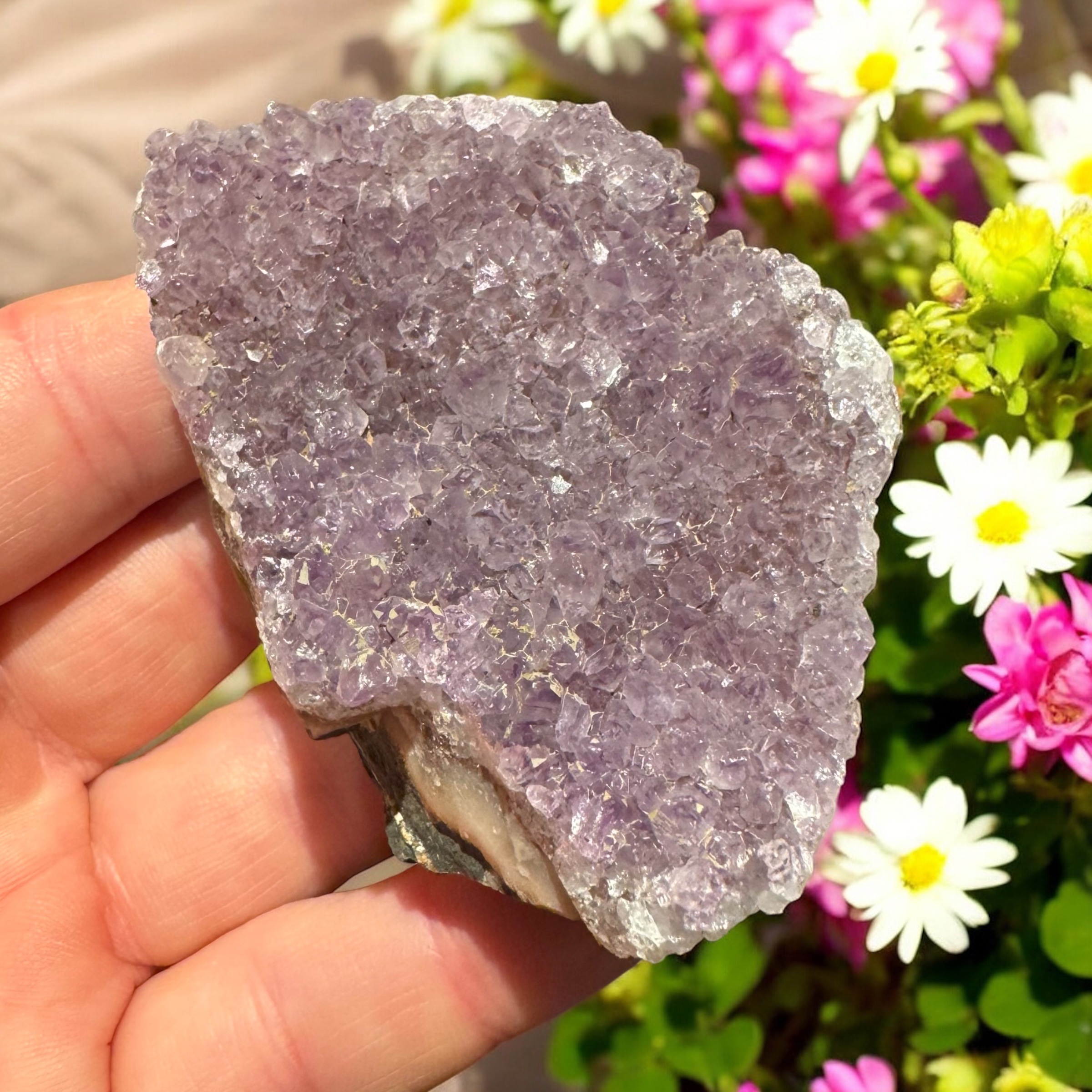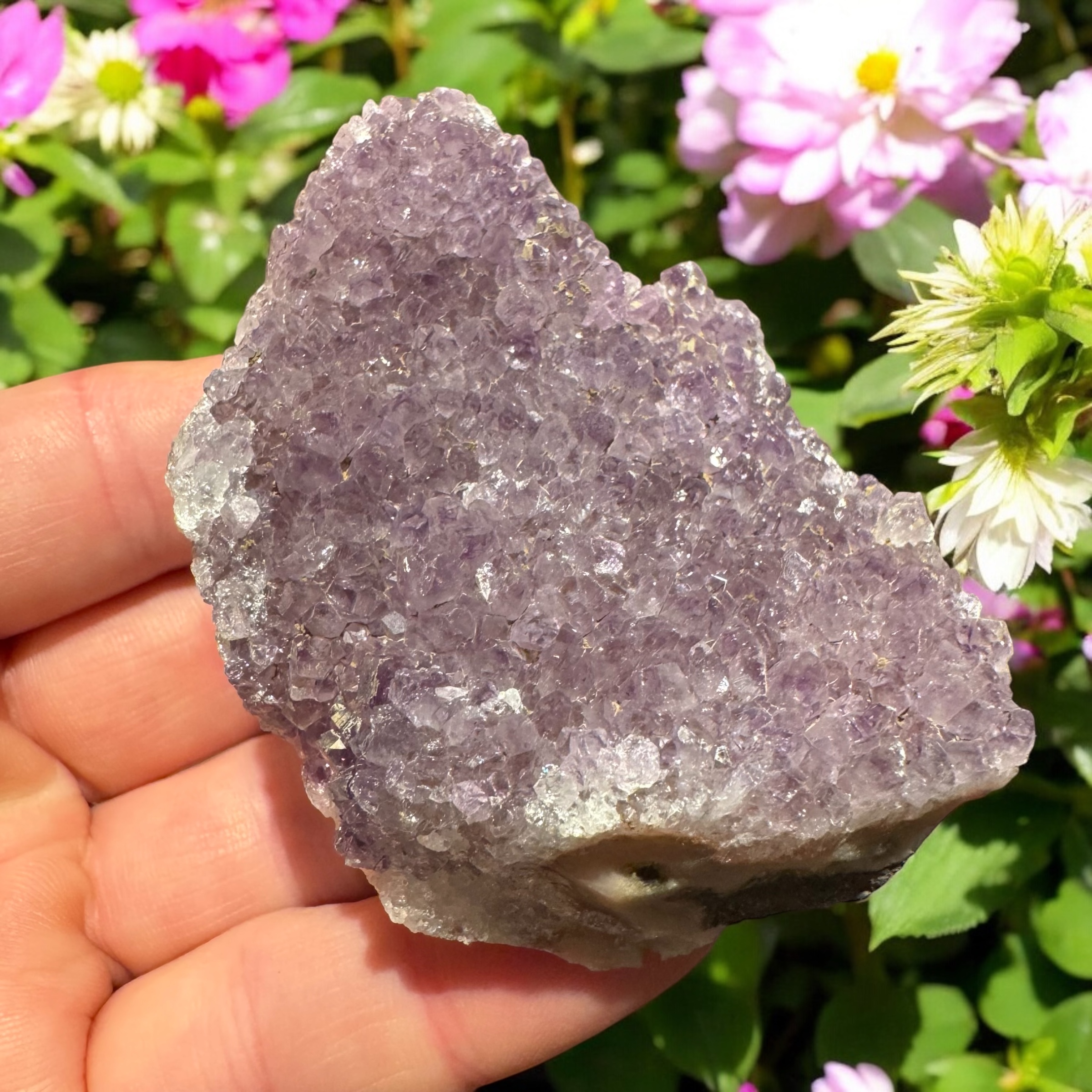 Ametyst klynge er tæt forbundet med det tredje øje- og kronechakraet, hvilket fremmer mental klarhed, åndelig oplysning og dyb meditation. Den hjælper med at åbne for spirituelle indsigter og balance i energifeltet.
