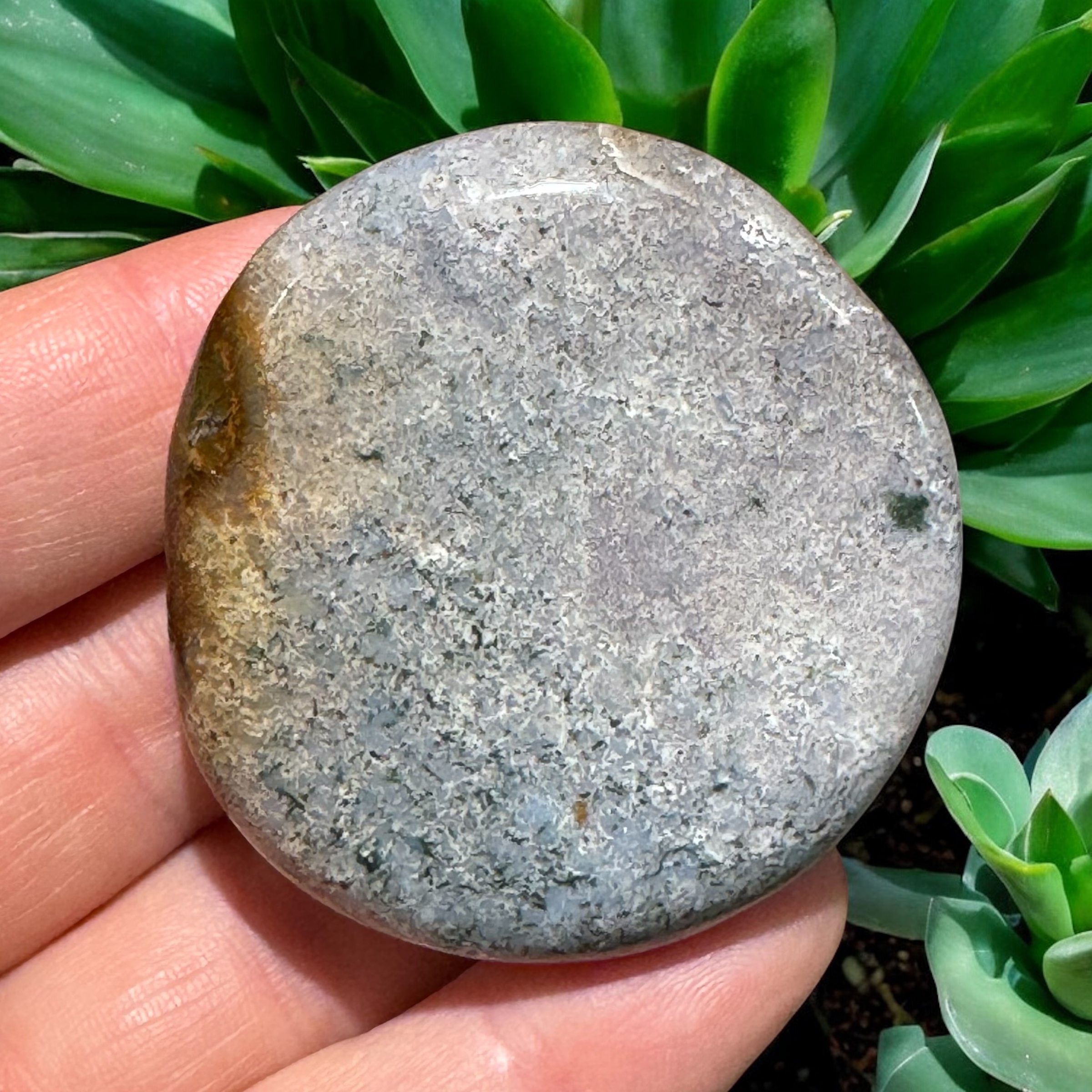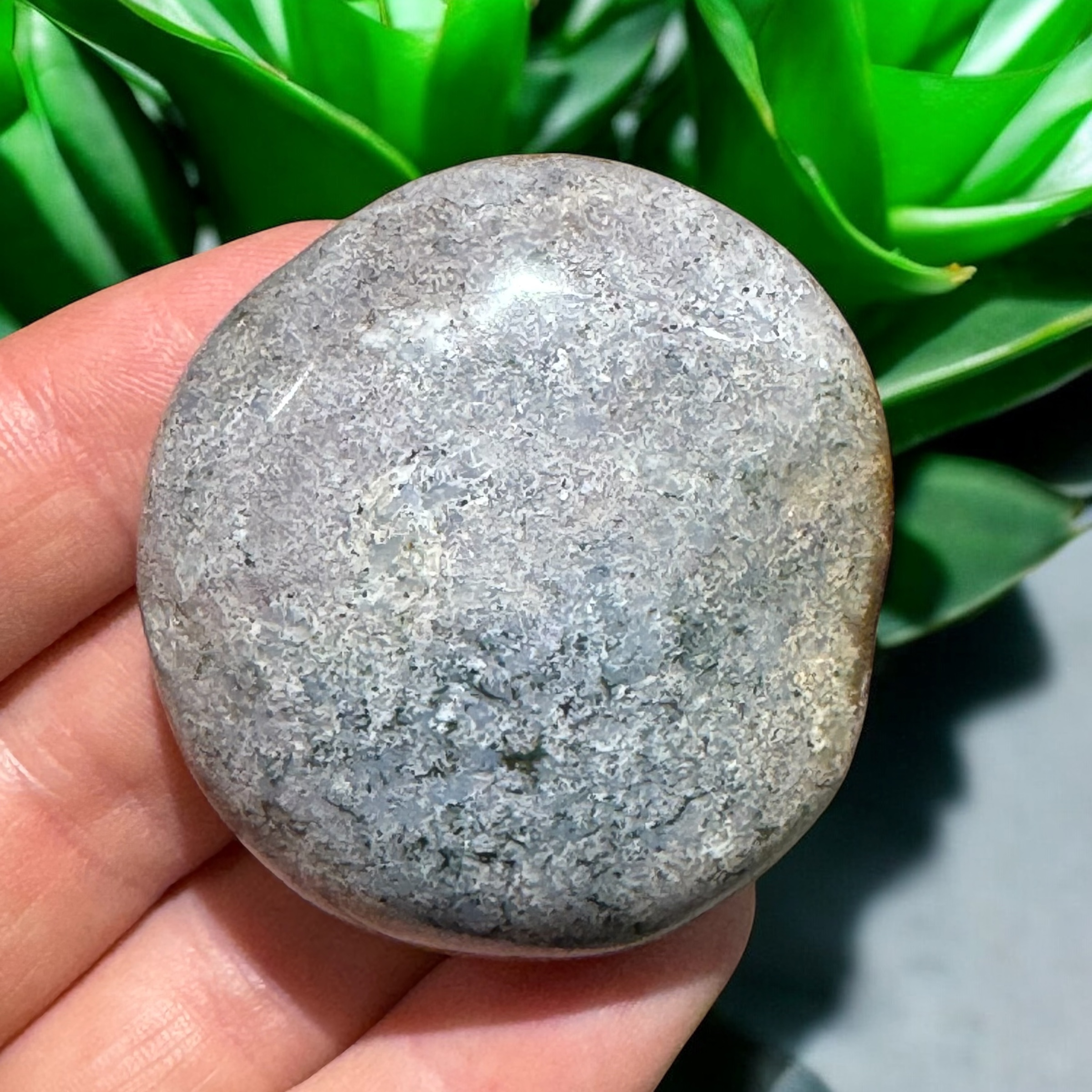 Denne smukke havjaspis i jumbo-størrelse (også kendt som Ocean Jasper) er en kraftfuld og beroligende sten med bløde, organiske mønstre i farver som grøn, beige, blå, rosa og hvid. Hver sten er helt unik og bærer en beroligende energi, som minder om havets konstante rytme og naturens cykliske visdom.