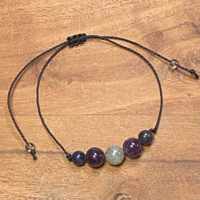 Alle armbånd sidder på et kort med en forklaring på de forskellige krystaller.