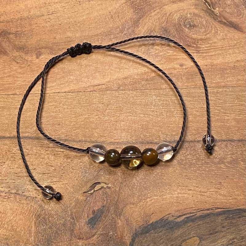 Alle armbånd sidder på et kort med en forklaring på de forskellige krystaller.