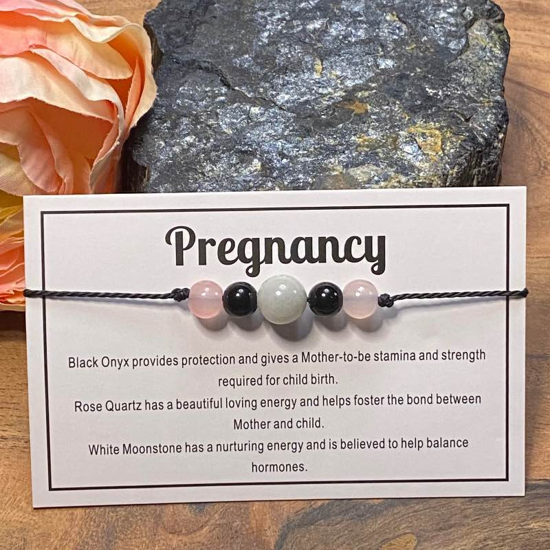 Alle armbånd sidder på et kort med en forklaring på de forskellige krystaller.